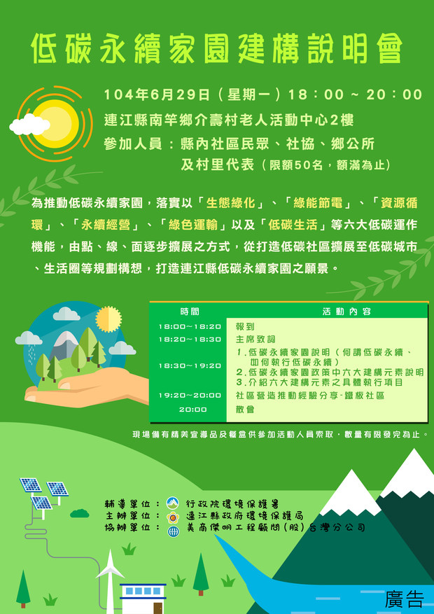 6/29辦理連江縣低碳永續家園建構說明會 --閱讀人次 : 872 連江縣政府環保局為推動低碳永續家園,以「生態綠化」、「綠能節電」、「資源循環」、「永續經營」、「綠色運輸」以及「低碳生活」等六大低碳運作機能與措施推動,打造縣內低碳綠色社區,並逐步發展成為低碳樂活島,特辦理低碳永續家園建構說明會,會中邀請新北低碳社區與鐵板社區講師說明低碳綠色社區建構方式與社區整體營造成功經驗,讓社區民眾更加了解日常居家低碳作為與如何營造綠色社區,由下至上累積村里的綠色能量,加速連江縣低碳永續家園推動發展。