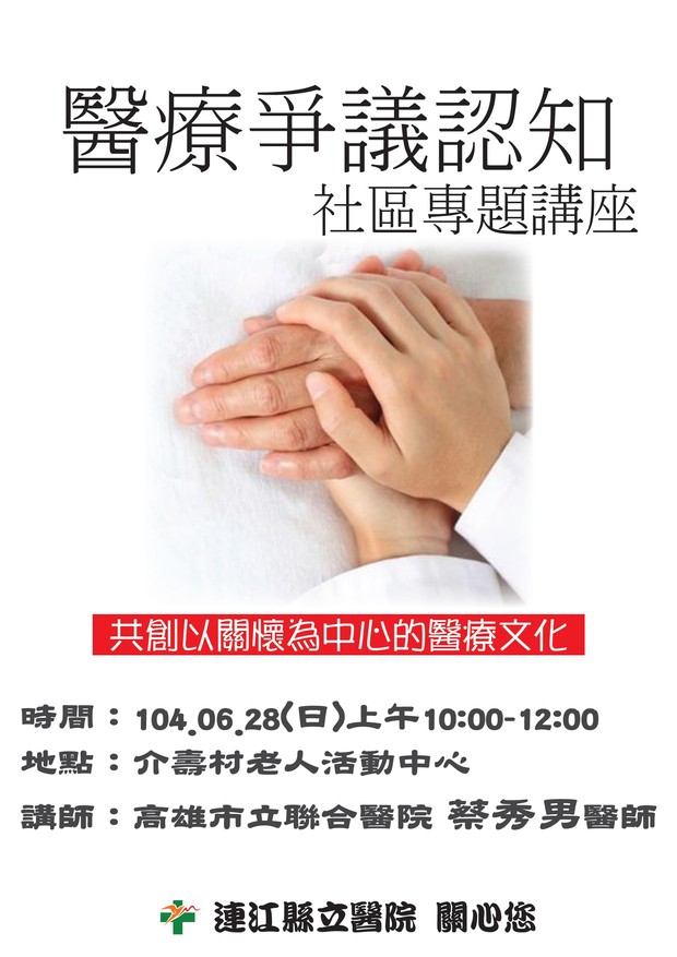 為促進醫病溝通調解,以落實醫療爭議之關懷與溝通管理,特辦此醫療爭議認知講座,期待建立以『關懷』及『同理心』為中心的醫療文化,有了良好的醫病信賴關係,才能促進病患身心健康,達到醫病雙贏。