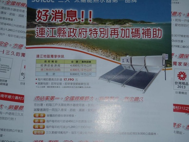 連江縣政府加碼補助安裝太陽能熱水器