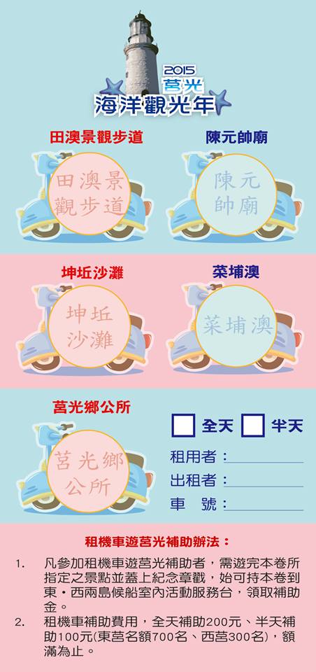 莒光海洋觀光年 背包客機車租用補助 --閱讀人次 : 865 【2015莒光海洋觀光年】背包客機車租用補助