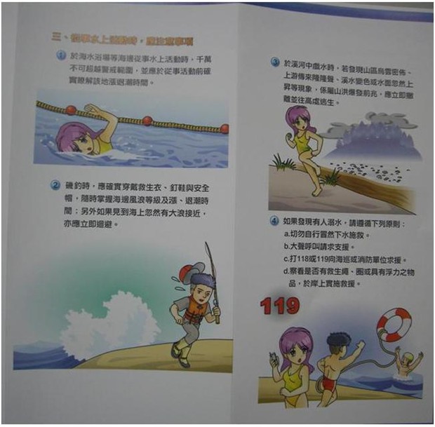 10. 如見有人溺水,趕緊大聲呼救,要打118海巡單位或119消防單位求救求援不要單獨下水救援。