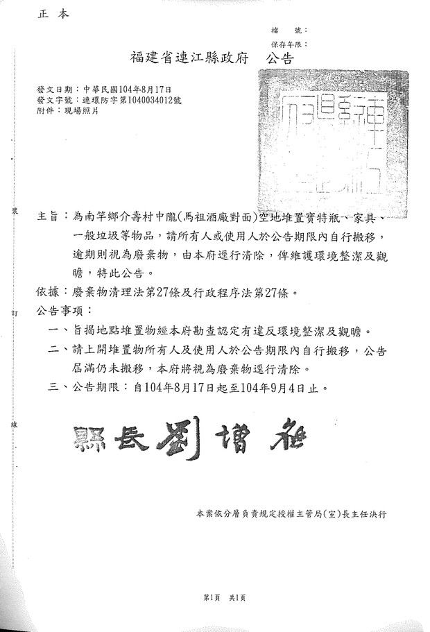 公告介壽村中隴(馬祖酒廠對面)空地堆置物