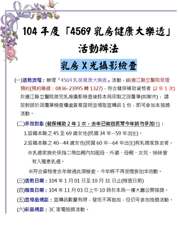 為守護婦女們的健康,衛生局再次提醒您,符合年齡及資格,請每2年1次定期免費乳房X光攝影檢查,並可就近至連江縣立醫院預約篩檢還可參加抽獎,詳細活動辦法如下: