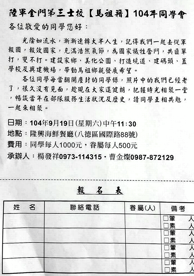陸軍金門第三士校(馬祖籍)104年同學會