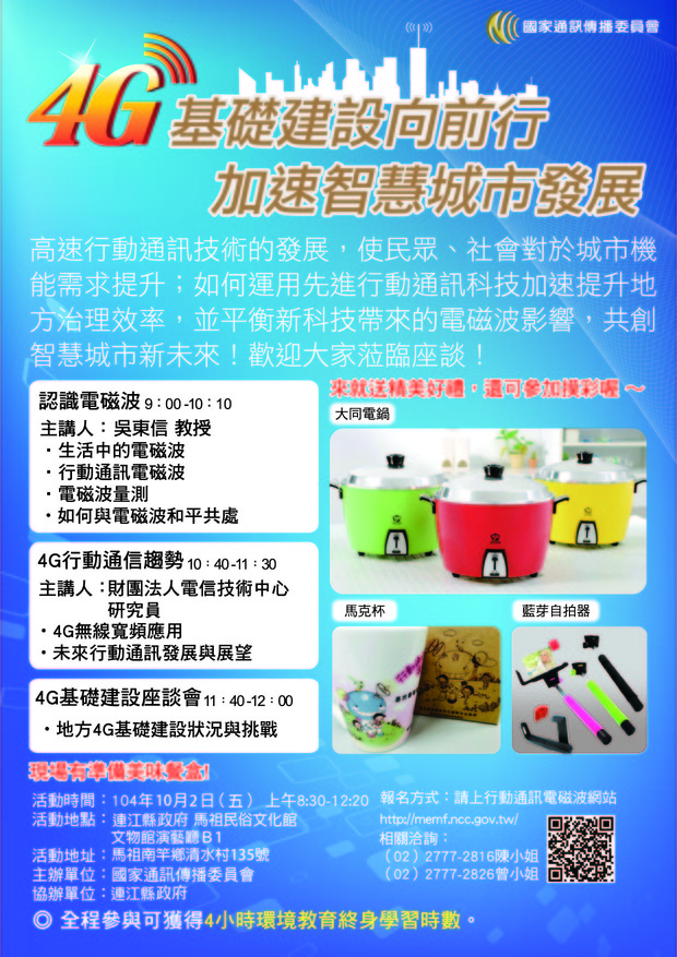 來參加講座即可獲得精美禮品,並大同電鍋、藍芽自拍器等精美摸彩禮品,中獎率達30%以上!誠摯歡迎各位前來共同參與。請上http://memf.ncc.gov.tw/電磁波宣導網站報名或電洽02-27772816。