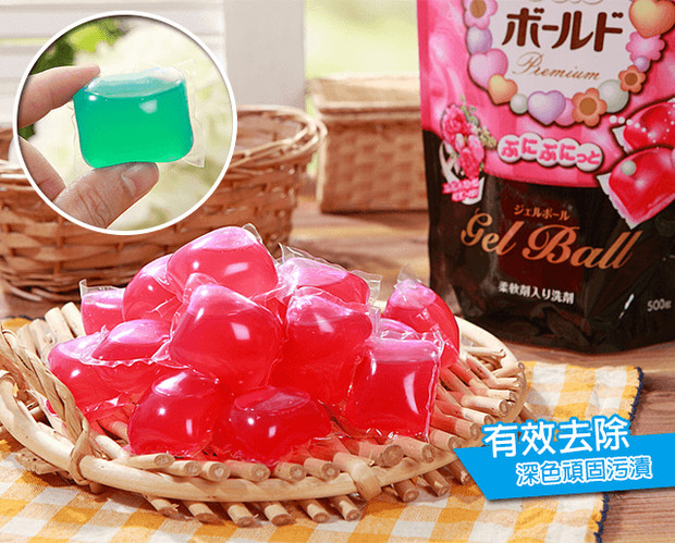 一次丟入一顆,乾燥拿取不沾手。所有淨白因子都在膠球裡,有效去除頑固髒汙!