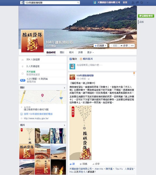 FB請搜尋104年鐵板燒塔節,消息搶先看 --閱讀人次 : 784 連江縣政府文化局將於104年10月3日(六)舉辦秋季三大慶典之一「104年鐵板燒塔節」活動,以流傳百年的燒塔古禮為號召,傳達除穢送厄的美好涵義。今年為使鐵板燒塔節名聲遠播,透過網路媒介讓各地民眾知曉,因此正式成立「104年鐵板燒塔節」FB活動粉絲專頁,讓所有民眾都可以透過粉絲專頁平台的查詢、發問及分享相關訊息,隨時掌握「104年鐵板燒塔節」的第一手消息,也可藉由活動粉絲專頁與民眾進行更貼近的互動。