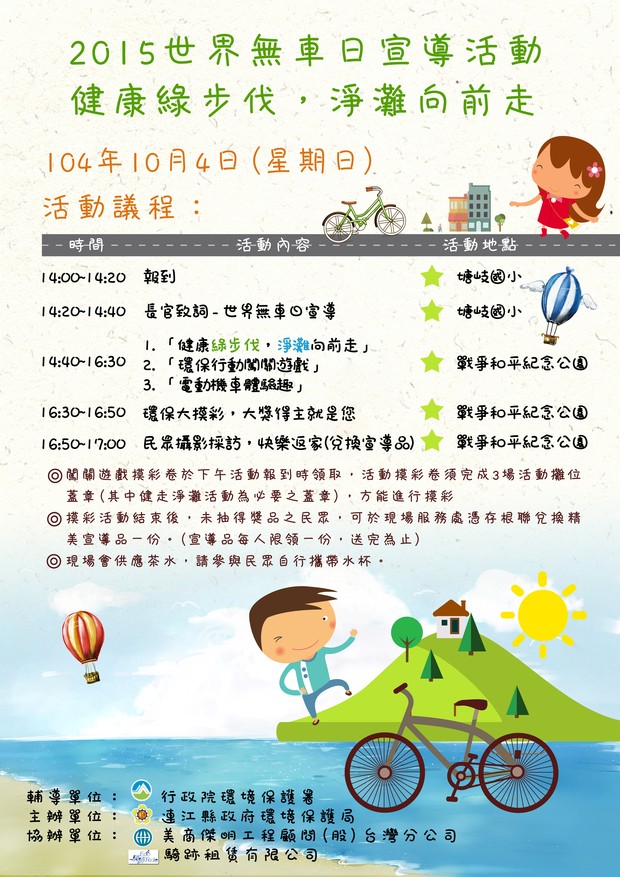 104年連江縣世界無車日活動訂於10月4日下午2點於塘岐國小、戰爭和平紀念公園舉行,歡迎共同響應國際無車日環保運動,現場參加就有機會獲得豐富大獎。