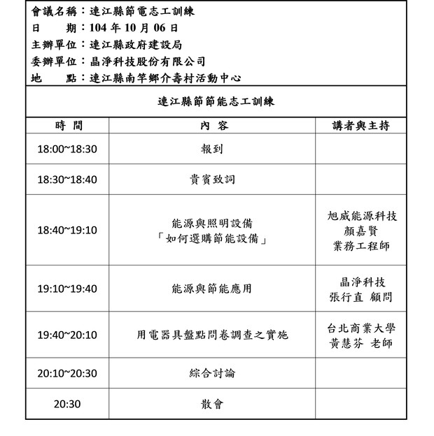 本次節電志工訓練活動將於104年10月6日晚間6點於南竿鄉介壽村活動中心辦理,詳細流程如附表。