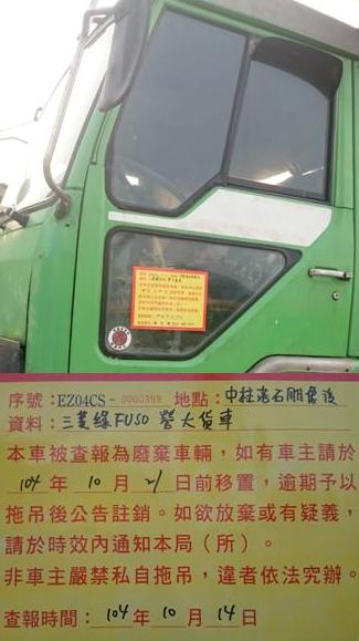 一、被查報為廢棄無牌車輛,如有車主者請於104年10月21日前移置,逾期本所將發文請縣府環保局予以拖吊後公告註銷。