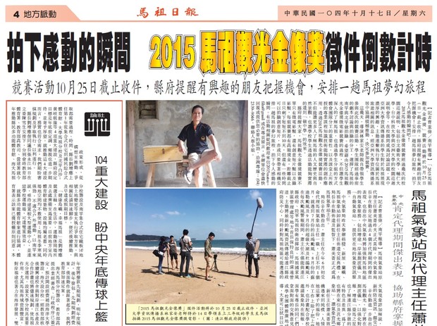 「2015馬祖觀光金像獎」徵件倒數計時 --閱讀人次 : 526 【記者曹重偉�南竿報導】「2015馬祖觀光金像獎」競賽活動將於10月25日(日)截止收件,縣府提醒有興趣的朋友把握機會!安排一趟馬祖夢幻旅程,拍下令人感動的瞬間吧!