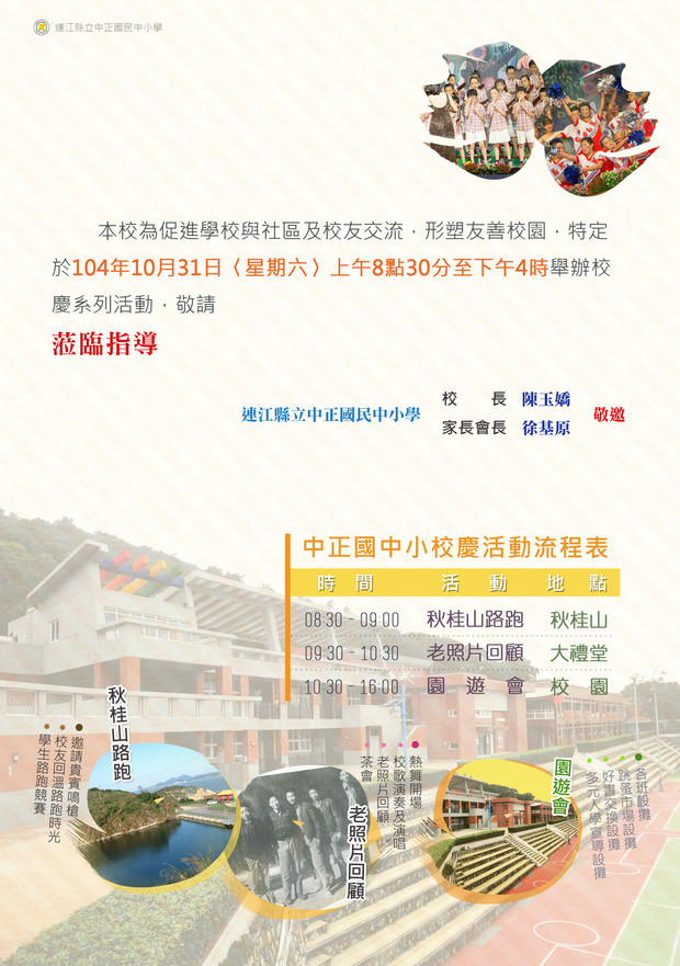 10月31日中正國中小校慶活動 --閱讀人次 : 820 70年代每週有兩天晨跑秋桂山體育活動,期間就讀本校學生皆記憶猶新而且留戀難忘,本年校慶邀請校友返校回溫當年晨跑秋桂山的記憶,找回青春的印記,歡迎校友結伴返校與學弟妹一起繞著秋桂山晨跑。