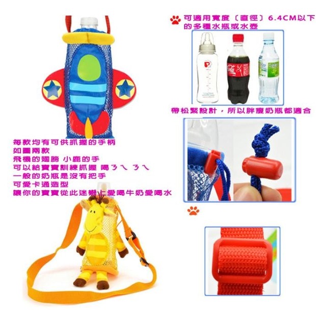可調式背帶,可手提、單肩背或斜背,背帶可根據身高調整到最舒適長度,讓孩子可以輕鬆帶著走。伸縮鬆緊帶可適當將瓶頸固定,不讓瓶身搖搖晃晃!可愛卡通造型,增添喝水的樂趣!共有五款可選。
