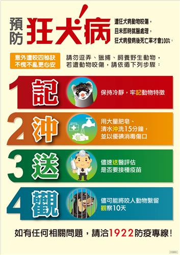 疾管署提醒,民眾至流行地區應避免接觸野生動物,如不慎遭動物咬傷,請以肥皂及大量水清洗傷口15分鐘,再以優碘或70%酒精消毒後儘速就醫,經醫師評估若有感染狂犬病風險,應儘速注射人類狂犬病免疫球蛋白,並依時程(咬傷後第0、3、7、14、28天)接種五劑疫苗,以降低發病風險。此外,請於返國入境時主動告知檢疫人員,以利轉介接受狂犬病疫苗接種。相關資訊可至疾管署全球資訊網(http://www.cdc.gov.tw)或撥打免費防疫專線1922(或0800-001922)洽詢。