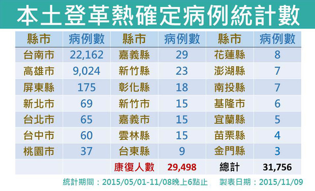 自入夏以來全國本土病例累積31,756例,台南市佔22,162例、高雄市佔9,024例、屏東縣佔175例,其餘縣市均為移入之散發疫情。昨日新增1例疑似登革熱死亡個案,目前累計死亡人數141人(台南市110例、高雄市29例、屏東縣2例),29例疑似死亡病例待審(高雄市21例、台南市7例、屏東縣1例),全國仍有28人於加護病房治療。這波疫情已有29,498名確診病患康復,康復率92.9%。