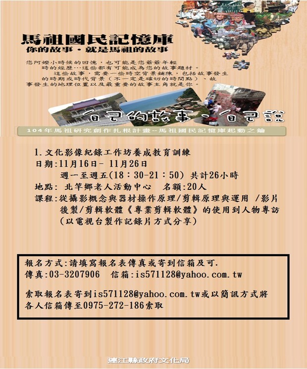 這次 文化局藉由影像紀錄工作坊養成教育訓練.以電視與電影製作團隊分享製作方式提昇在地文化記錄者的技巧.推出影像紀錄工作坊計畫.邀請熱愛影像紀錄的鄉親.一同為我們這塊土地.說故事.作記錄.你的故事就是馬祖的故事