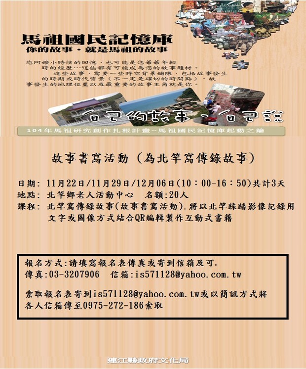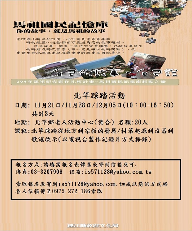 北竿踩踏&故事書寫活動 --閱讀人次 : 807 活動內容:真誠面對生命記錄文化/將經歷或聽到的故事/經記錄化處理/排列編寫出感動人心的記錄互動本/就是記錄文化的使命