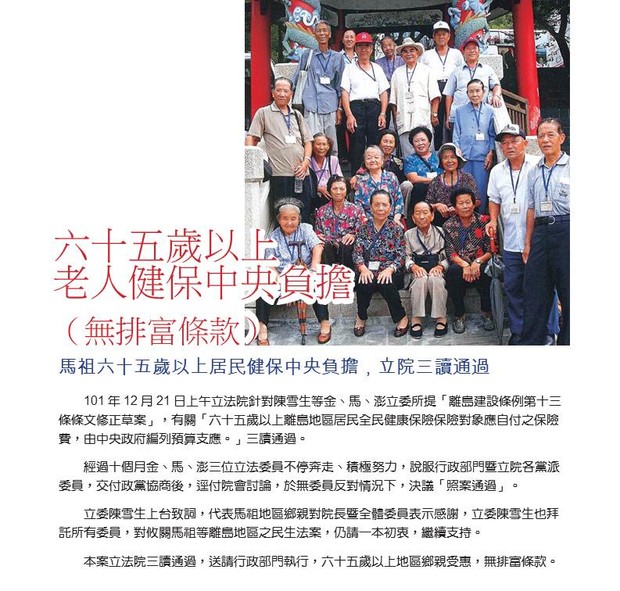 雪生問政系列-65歲以上老人健保中央負擔 --閱讀人次 : 739 101 年 12 月 21 日上午立法院針對陳雪生等金、馬、澎立委所提「離島建設條例第十三 條條文修正草案」,有關「六十五歲以上離島地區居民全民健康保險保險對象應自付之保險 費,由中央政府編列預算支應。」三讀通過。