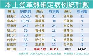 自入夏以來,全國本土病例已達36,507例,其中台南市佔22,520例、高雄市佔13,293例、屏東縣佔245例,其餘縣市均為移入之散發疫情。昨日無新增疑似登革熱死亡個案,總計目前累計死亡人數為158人(台南市112例、高雄市44例、屏東縣2例),32例疑似死亡病例待審(高雄市30例、台南市2例),全國仍有56人於加護病房治療。但已有33,827名確診病患康復,康復率92.7%。