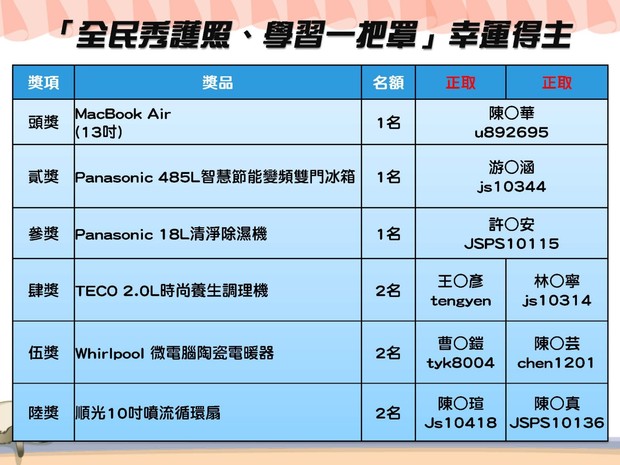 將於局官方網站和粉絲專頁公布幸運得主,並以『雙掛號』方式寄出「得獎通知單」分別知會得獎者,若於收到信件5日內未收到得獎者回覆,視同得獎者自動放棄權利,由備取名單遞補。有關護照抽獎疑問,可撥打諮詢電話(0836) 26520轉165 甘小姐。