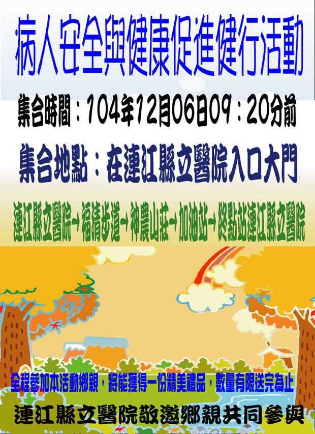 12/6縣立醫院病人安全暨健康促進健行活動 --閱讀人次 : 1040 連江縣立醫院為促進本縣鄉親之間情誼交流,舒展身心,鼓勵走向戶外,接觸大自然進而擁抱健康,讓鄉親在活動中體會大自然的美與健康的重要。