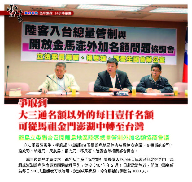 雪生問政系列─爭取到 大三通名額以外的每日壹仟名額 --閱讀人次 : 790 爭取到大三通名額以外的每日壹仟名額可從馬祖金門澎湖中轉至台灣