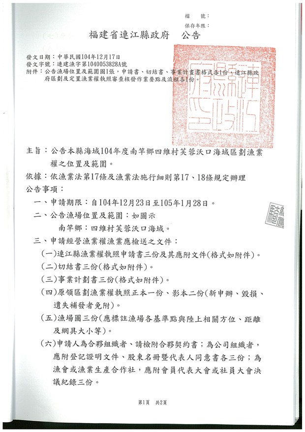 公告104年南竿鄉區劃漁業權位置及範圍 --閱讀人次 : 1334 依據:依漁業法第17條及漁業法施行細則第17、18條規定辦理