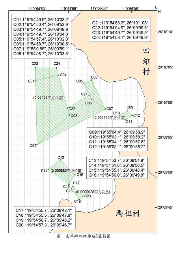 二、 公告漁場位置及範圍:如圖示,請洽各鄉公所、馬祖區漁會或建設局漁業課或由附件下載。