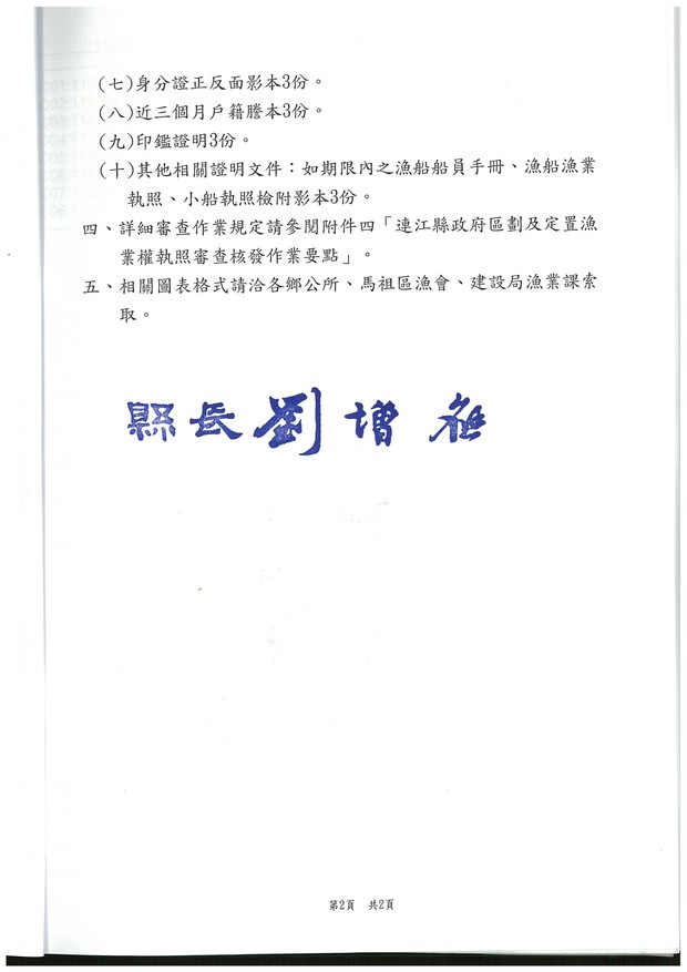 四、 詳細審查作業規定請參閱附件四「連江縣政府區劃及定置漁業權執照審查核發作業要點」。