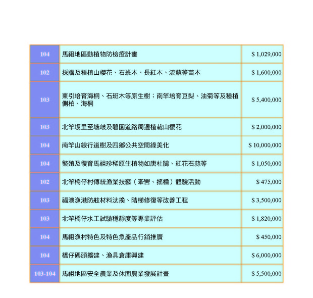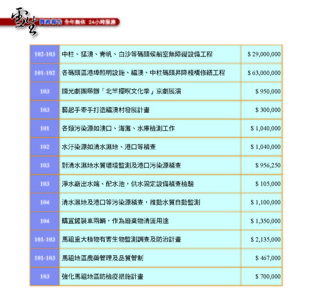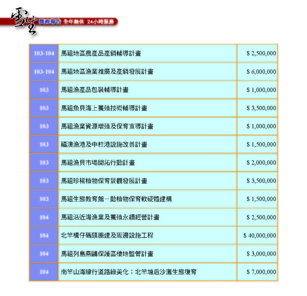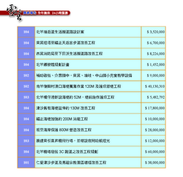 101~104 年 雪生暨偕同縣府向中央爭取馬祖地區各項建設補助經費