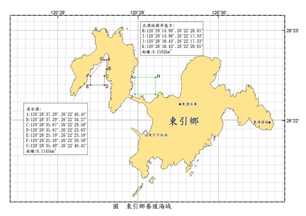 二、公告漁場位置及範圍:如圖示,請洽各鄉公所、馬祖區漁會或建設局漁業課。