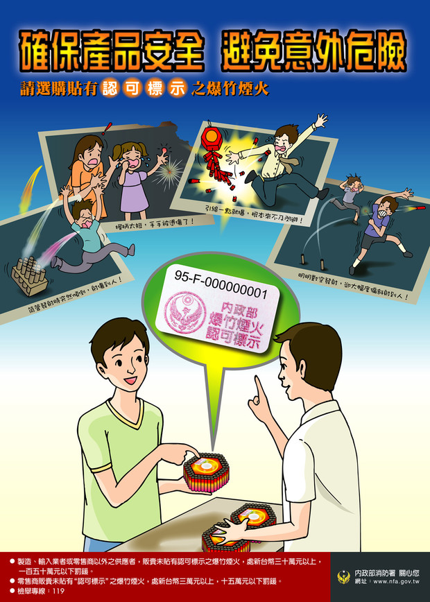 介壽分隊提醒使用爆竹、用火用電注意事項 --閱讀人次 : 530 元宵節期間各廟宇辦理「擺暝」儀式及神明們繞境巡行活動,民眾燃放爆竹煙火使用量大,應選購有認可標示之一般爆竹煙火產品(如下圖),以維自身安全。如有發現非法製造、儲存或販賣爆竹煙火之情形,請立即撥打119或本分隊23685檢舉。
