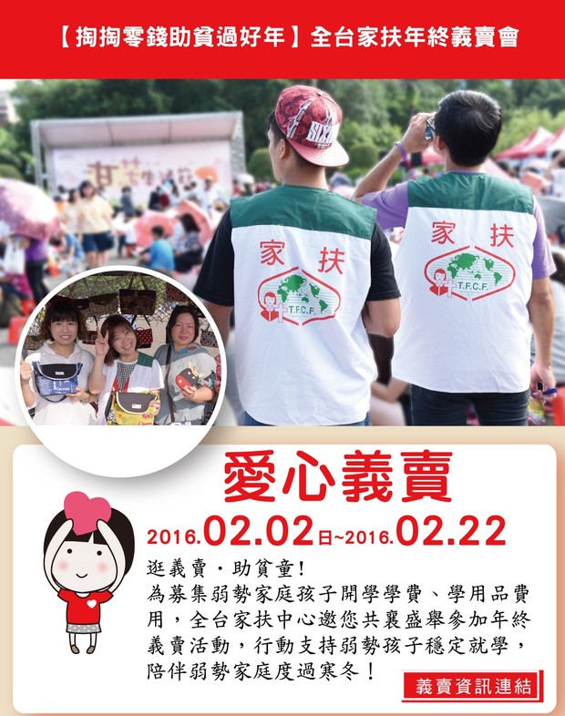 馬祖家扶中心目前經濟扶助的家庭共有13戶,約有30名兒童,許多孩童處在家人生病或不在身邊,貧困兒童得幫忙做家事、照顧年紀小的弟妹或照護生病的父母、長輩。家扶基金會為了一圓弱勢孩子的升學夢,全台家扶陸續於2/2-2/22期間,募集多項義賣品,幫助即將開學的孩童們不因家中經濟收入不佳而無法升學。