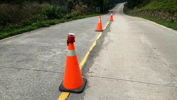 【記者陳鵬雄報導】北竿道路坑洞多危及行車安全,公所啟動開口契約請廠商展開全島道路坑洞修補計畫,最近開車在路上的駕駛人要注意,凡設有故障警示錐的地方都是剛補的水泥,千萬別輾過去。