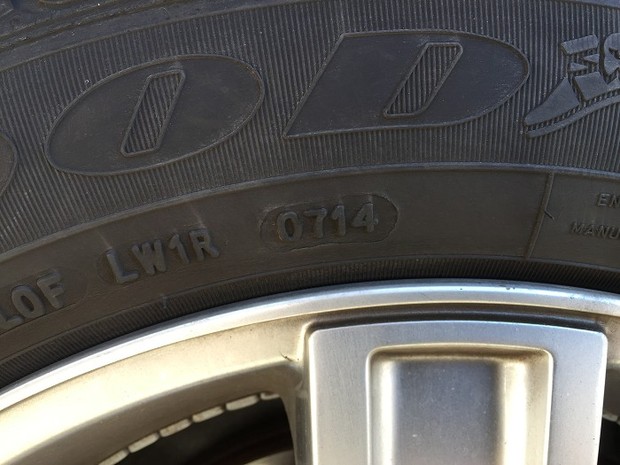 3. 購買或換裝新輪胎時,應注意胎邊標示製造日期4位數字,前2位數為出廠周數,後兩位數為西元年(如圖2),超過製造日期6年之新輪胎不得安裝於汽車。