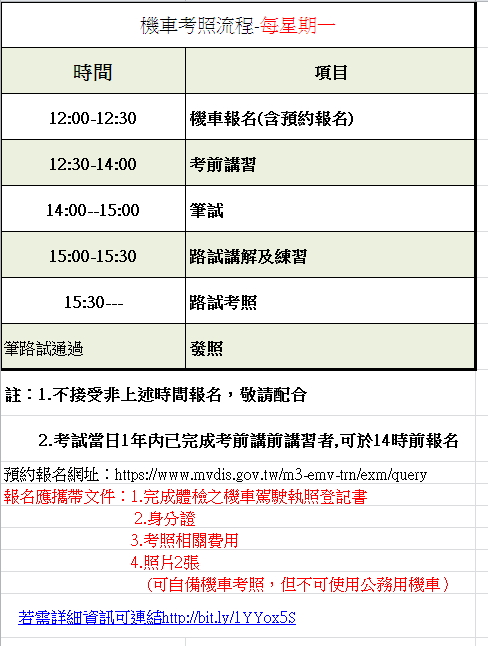 因應機車考照增列考前講習及路考項目,為充裕考生應考時間,本站自4月份起每星期一提前至中午12:00開始報名,相關流程如下圖。