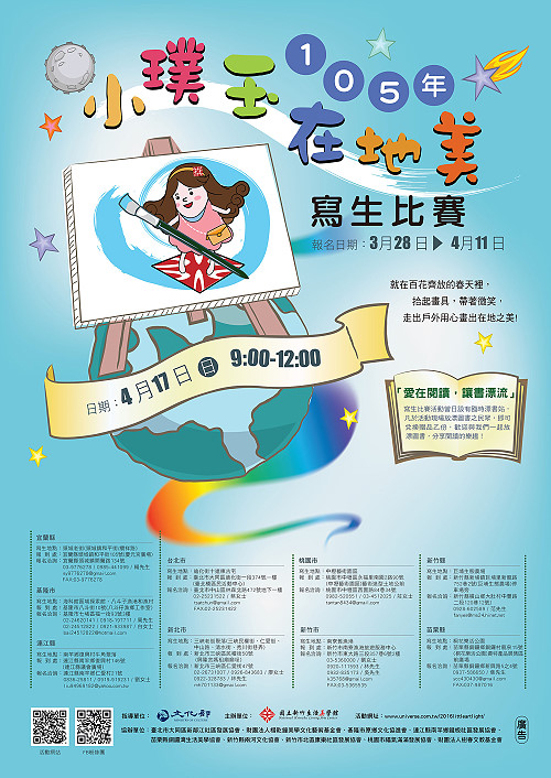 全國小璞玉在地美寫生比賽 --閱讀人次 : 724 馬祖小畫家就是您!國立新竹生活美學館將於4月17日(本週日)上午9時至12時於北區9縣市同步舉辦小璞玉在地美寫生比賽,歡迎全國喜愛畫畫的國中、小學生報名參加。馬祖地區預定受理報名至4月15日止,參加者可獲得精美宣導品1份,意洽執行單位鐵板社區發展協會(地址:南竿鄉仁愛村21號),聯絡人劉女士,電話0919-919231,電子信箱:li-u94969182@yahoo.com.tw。報名表請至http://www.nhclac.gov.tw「藝文活動」下載。