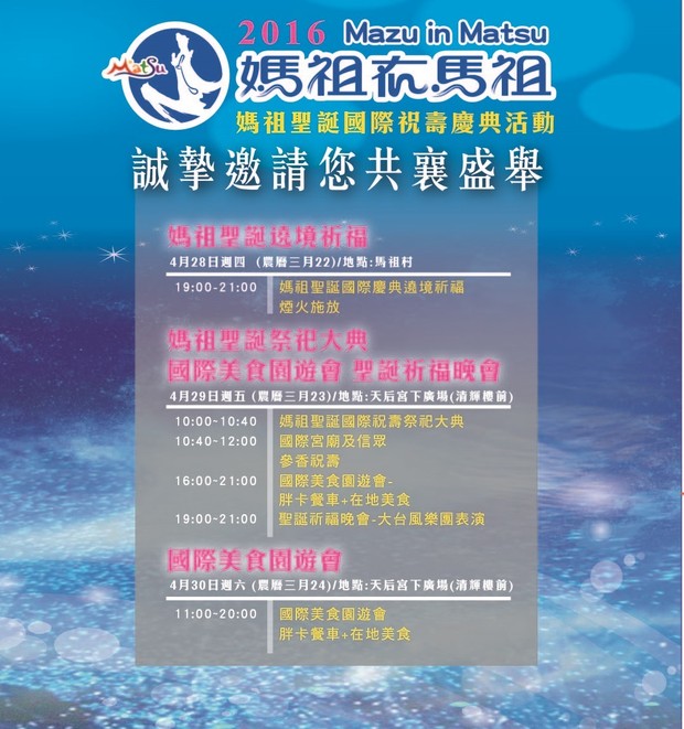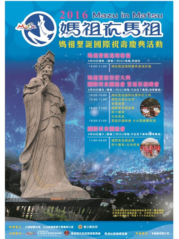 媽祖在馬祖-國際祝壽慶典活動4月28-30日 --閱讀人次 : 1766 2016媽祖在馬祖-媽祖聖誕國際祝壽慶典活動,即將在4月28日、29、30日展開系列祝壽慶典活動。最受歡迎的胖卡餐車及大台風樂團即將蒞馬為媽祖祝壽。