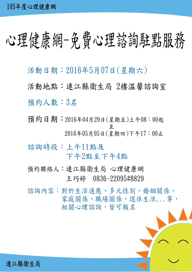 預約聯絡人:連江縣衛生局 心理健康網 王巧婷 0836-22095#8829