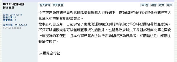 故本公司自五月一日起承包了南北海運每晚分別於南竿與北竿分時段開船尋找藍眼淚,不只可以讓觀光客可以發現藍眼淚的感動外,也幫縣政府解決了馬祖鄉親南北竿之間晚上無夜航的不便性,且本公司已是合法執行夜訪藍眼淚執行業者,相關適法性由相關主管單位核定。