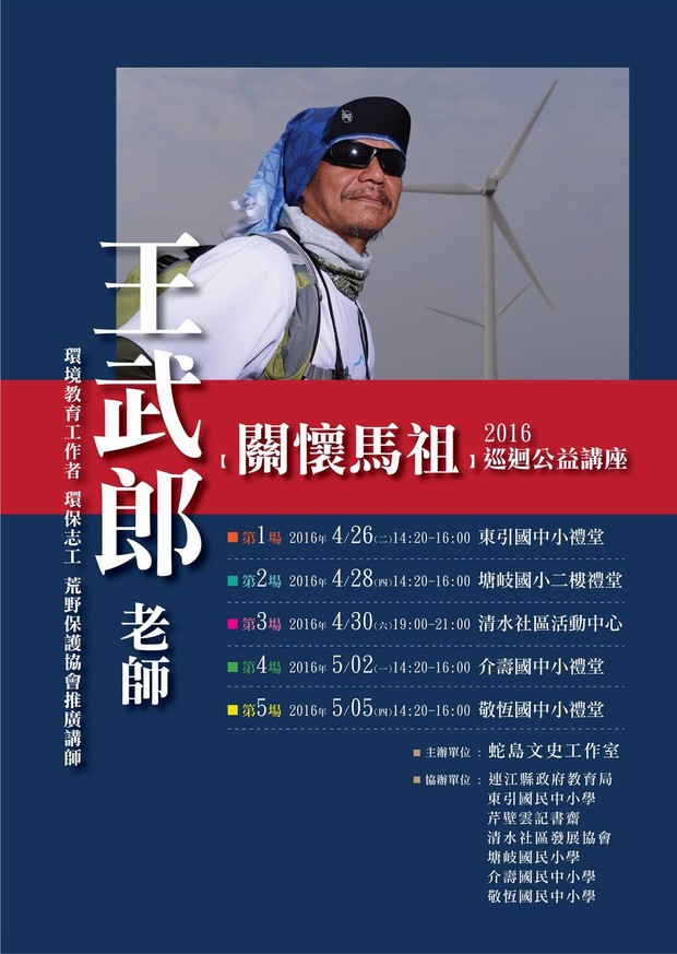 「關懷馬祖2016巡迴公益講座」今4/30星期六晚間7:00第三場次地點在南竿清水社區活動中心,歡迎南竿地區民眾前往聆聽,其他各場次講座日期地點如后: