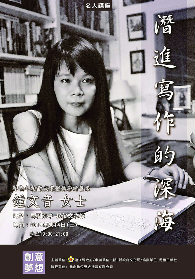 縣府文化局「馬祖藝文節、藝起飛揚」系列活動之名人講座第二彈!5月4日將邀國內知名小說散文兼攝影繪畫作家鍾文音女士主講「潛進寫作的深海」,歡迎軍民鄉親晚間7時前往民俗文物館聆聽。(圖:縣府文化局)