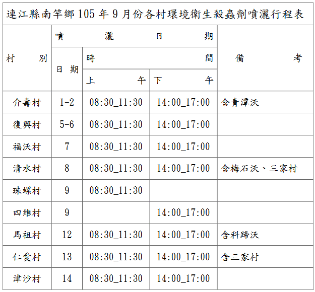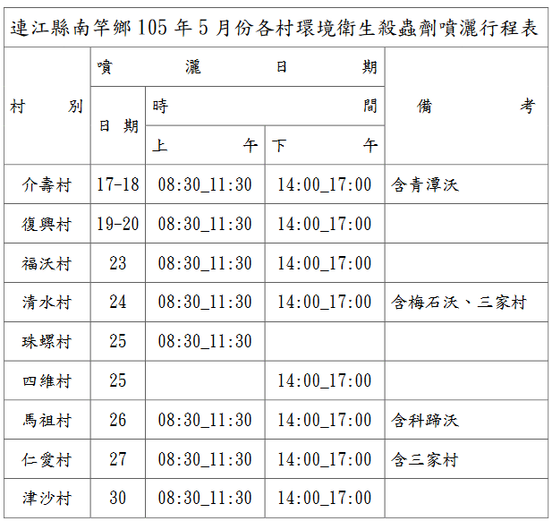 南竿鄉5、7、9月份各村殺蟲劑噴灑行程表