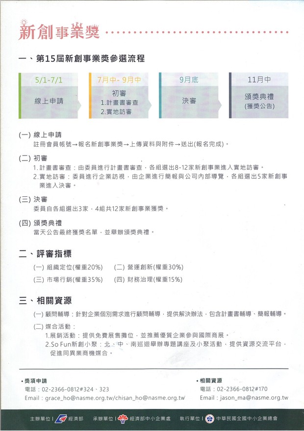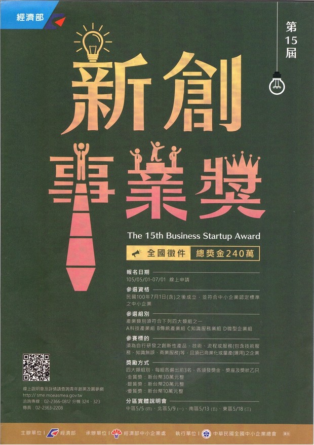經濟部中小企業處-新創事業獎報名 --閱讀人次 : 540 新創事業獎為企業發展上「最佳新人獎」,自91年起開辦至今已執行14屆,獲獎企業達196家,根據獎項後續追蹤資料顯示,獲獎企業中已有17家上市、上櫃或公開發行,37家企業獲得國家磐石獎、創新研究獎或小巨人獎的肯定,更有38家企業已獲創投投資或大企業所併購,均展現獲獎企業優質的競爭實力及獲得市場高度肯定。