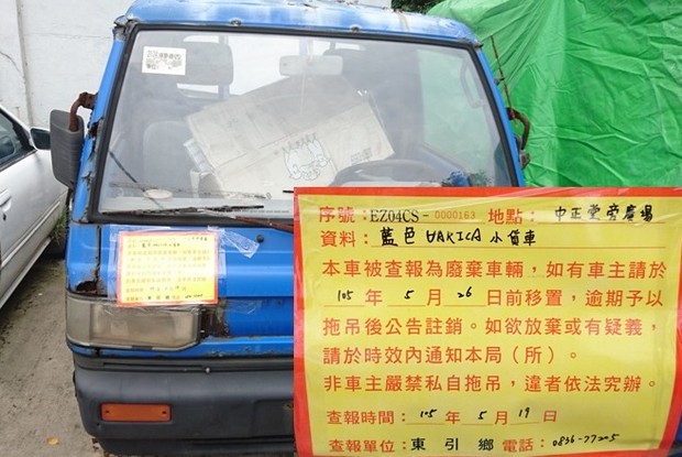 一、經本所查報為廢棄無牌車輛,如有車主者請於105年05月26日前移置,逾期本所將發文請縣府環保局予以拖吊後公告註銷。