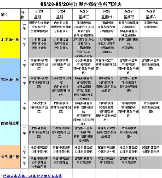 0523-0528各鄉衛生所門診表