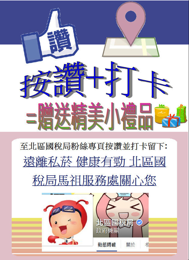二、活動開始後至財政部北區國稅局FB粉絲專頁完成指定打卡按讚活動即贈送大嘴猴塑膠筆盒加筆記本,名額有限,贈完為止。歡迎鄉親踴躍參加!