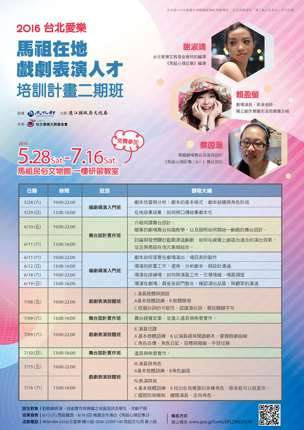 在地戲劇表演人才培訓II明民俗文物館開課 --閱讀人次 : 568 轉貼【記者曹重偉報導】地區喜愛戲劇民眾期待已久的「馬祖在地戲劇表演人才培訓計畫二期班」,系列課程將於本週六(5月28日)於民俗文物館一樓研習教室正式起跑!由台北愛樂專業團隊進駐指導包括【編劇導演入門班】、【舞台設計實作班】、【戲劇表演肢體班】;如因天候因素,28日當天老師無法蒞馬授課,會在馬祖日報公布相關消息。
