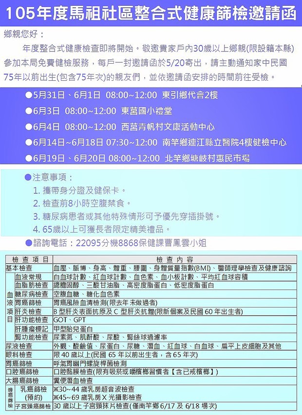 莒光社區3、4日整合式健康篩檢 衛生局邀請函