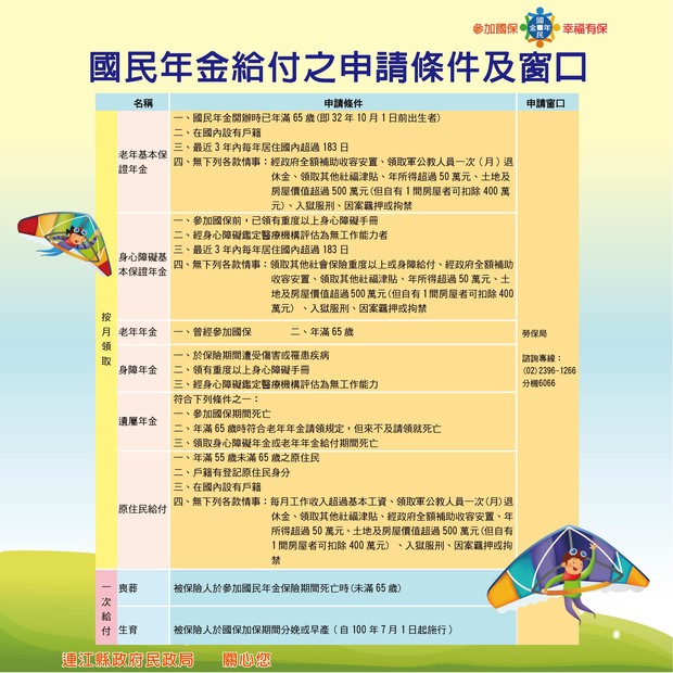 105年度國民年金保險業務說明會(北竿場) --閱讀人次 : 612 國民年金是97年10月1日開辦的社會保險制度,主要納保對象是年滿25歲、未滿65歲,在國內設有戶籍,且沒有參加勞保、農保、公教保、軍保的國民。國民年金提供「老年年金」、「身心障礙年金」、「遺屬年金」三大年金給付保障,及「生育給付」、「喪葬給付」二種一次性給付保障。被保險人只要按時繳納保險費,如有生育、遭遇重度以上身心障礙或死亡事故,以及年滿65歲時,就可以依規定請領相關年金給付或一次性給付,以保障本人或其遺屬的基本經濟生活。
